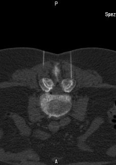 - Thermische Verödung: Dabei werden mit Hilfe des Hochfrequenzstroms die versorgenden Nerven (medialer Ast des Ramus dorsalis N.spinalis) der jeweiligen Gelenken verödet. Die Behandlung findet ambulant und unter Lokalanästhesie (örtlicher Betäubung)mit oder ohne Sedierung statt. Nach CT-gesteuerte Platzierung der Spezialsonden wird zunächst mit Hilfe eines speziellen Verfahrens der Nerv aufgesucht und dann gezielt mit ca. 90°C Temperatur verödet.